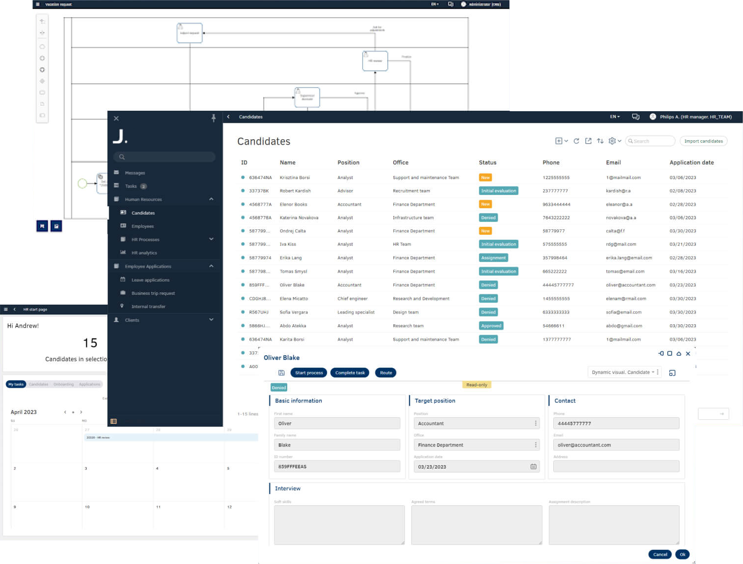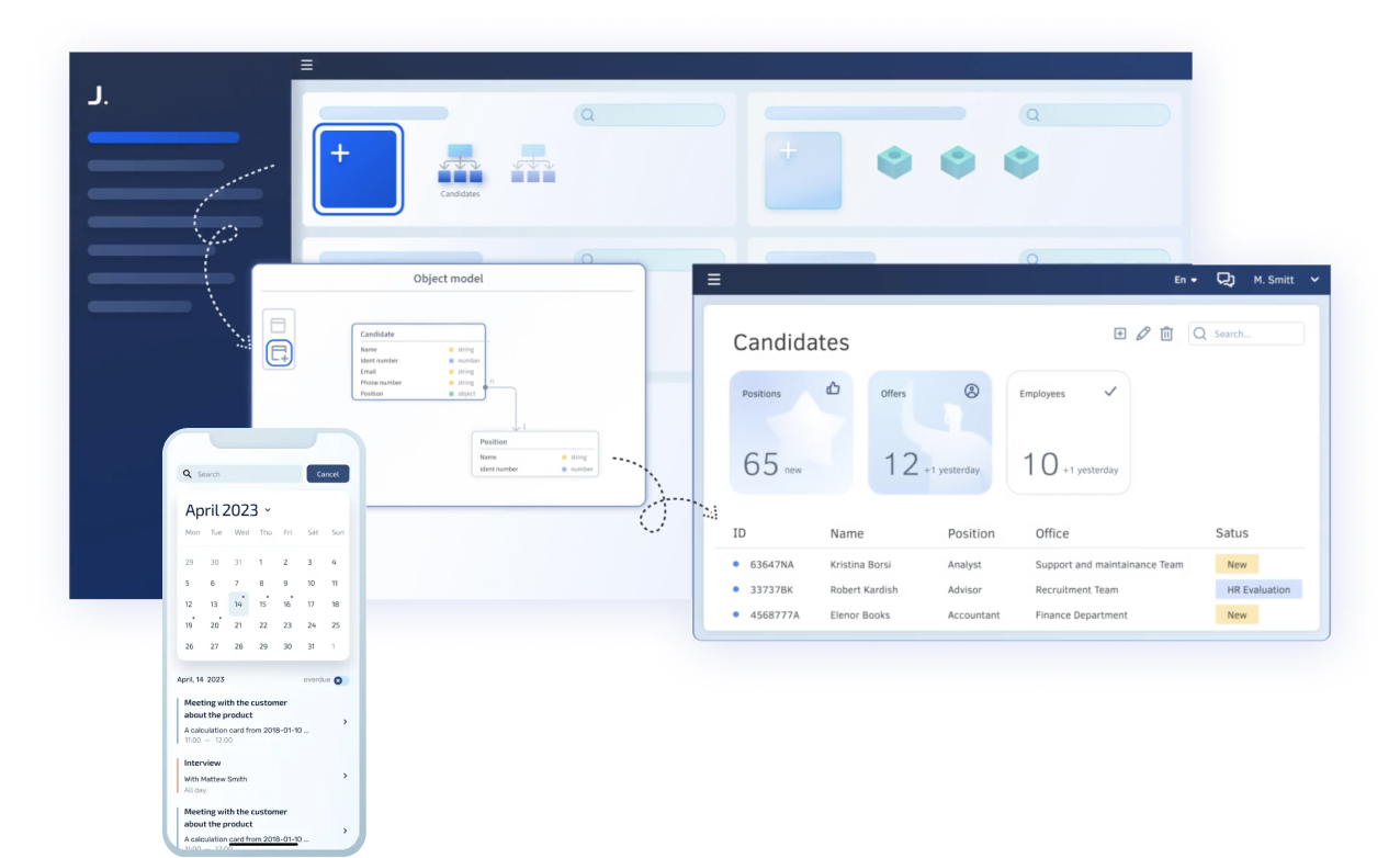 J. makes it possible to create complex solutions, for example CRM, EDMS, HRM, TMS, WMS, FM, MDM, ITSM, HRM, OMS, ERP, and others. You can also create IT systems to automate and manage narrow business processes, such as a credit conveyor or addressed warehouse storage system. The J. platform allows you to not only automate the work of any department in a company or large corporation, but also to combine the created solutions into a unified work ecosystem.